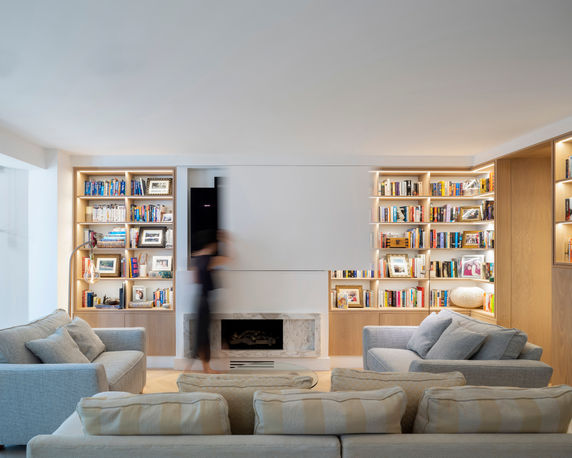 This project responds to its tight central London location, utilising every available inch of space and transforming an initially dark and damp flat. The flat was reconfigured to allow more space and light to the living spaces whilst creating a series of hidden spaces with a concealed study and subterranean ensuite bathroom. Built in joinery allows the space to transform and adapt for different uses.